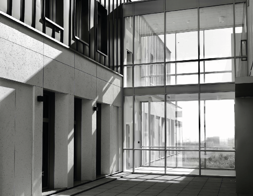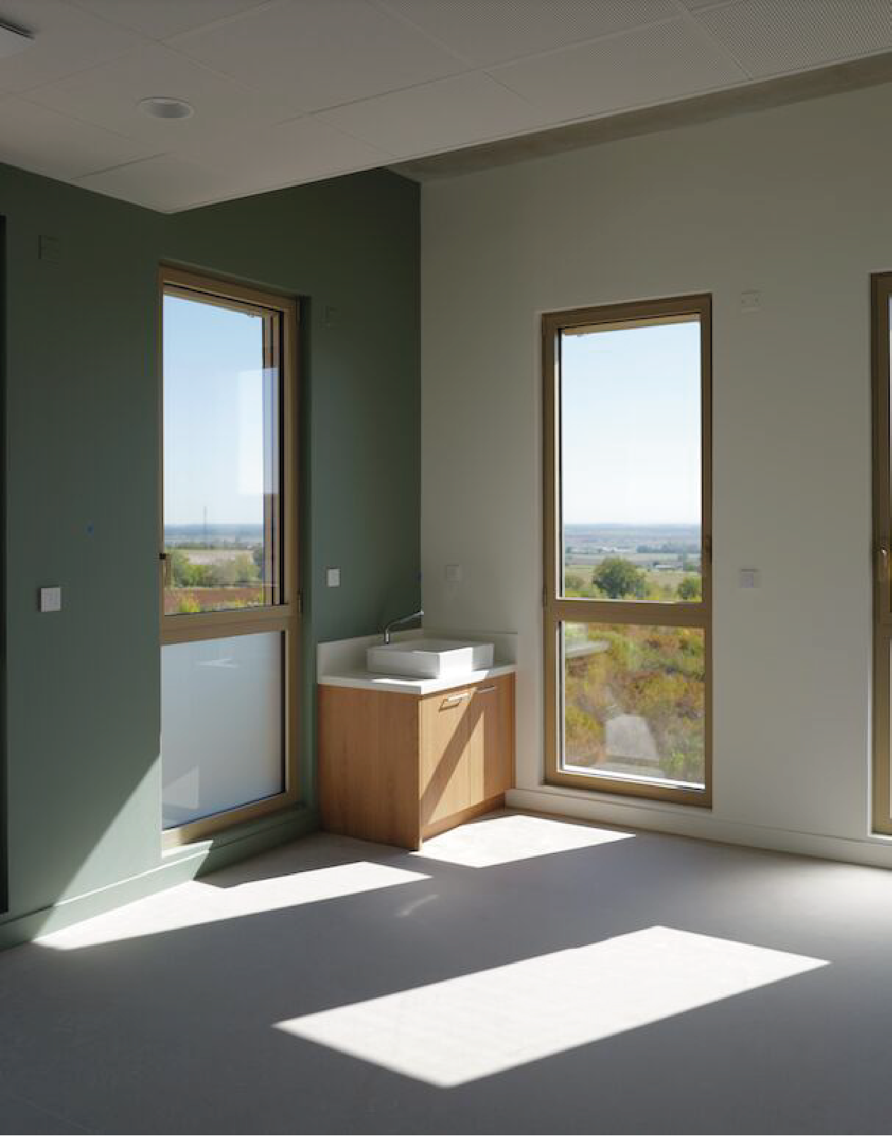 CARE Architecte a conçu des espaces généreusement éclairés et des environnements de travail en lien direct avec l’extérieur, une rareté dans ce type de programme. C’est la cas en particulier pour les postes de commande et les couloirs de radiothérapie, les postes de soins en cœur de bâtiment, et d’une façon plus générale pour l’ensemble des locaux.