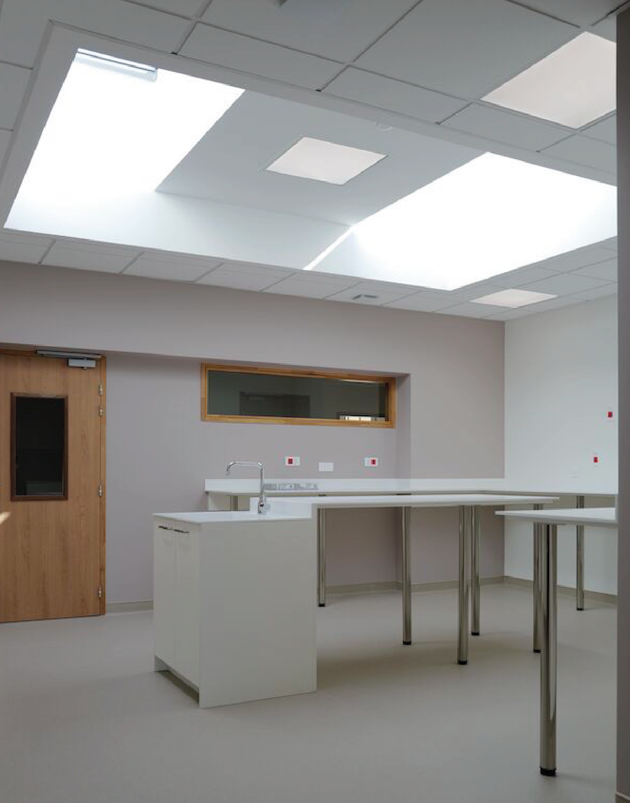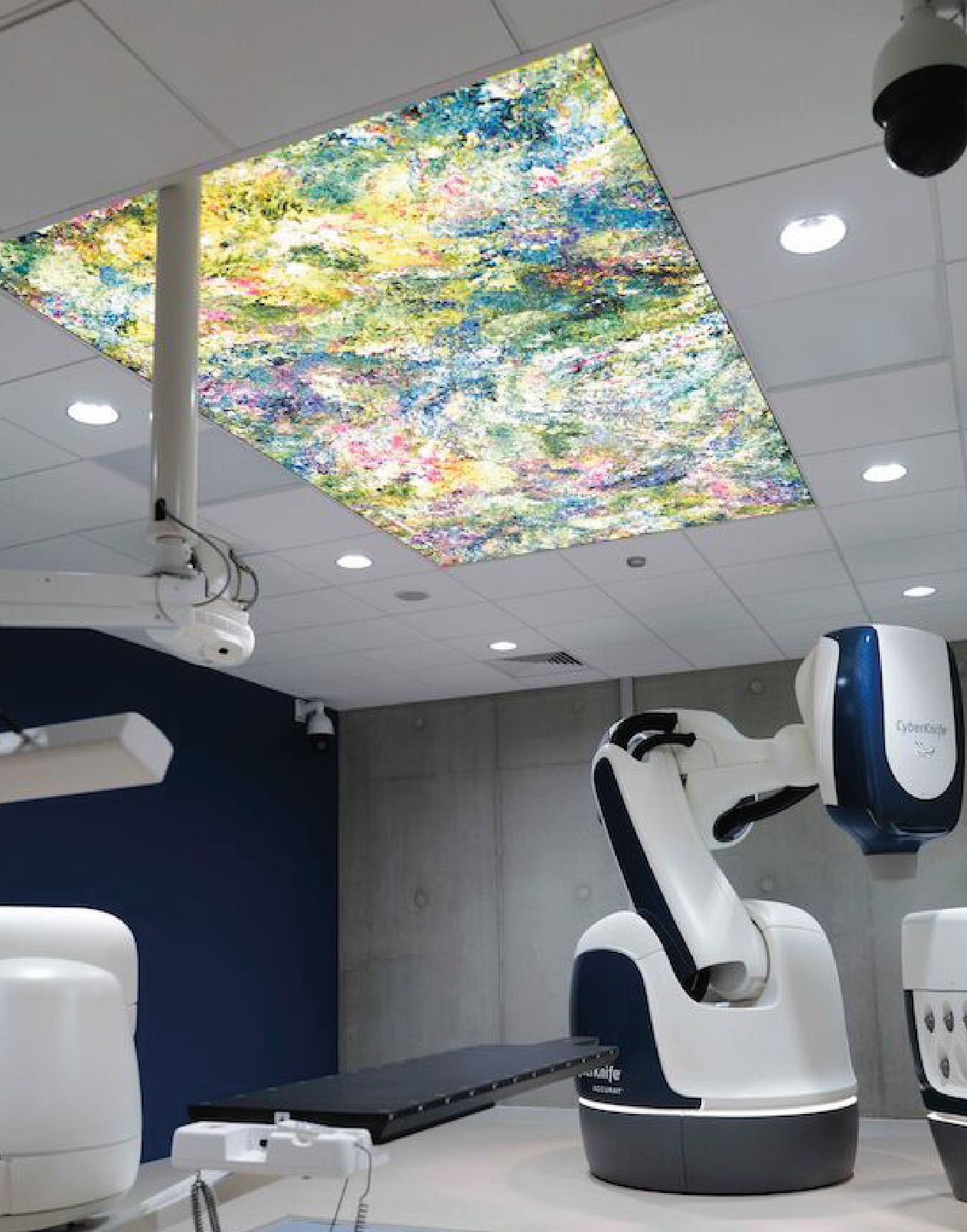Dans les bunkers de radiothérapie, un large plafond lumineux décoré d’une peinture de Vara Kamin crée une évasion lumineuse quand la lumière naturelle n’est pas disponible.