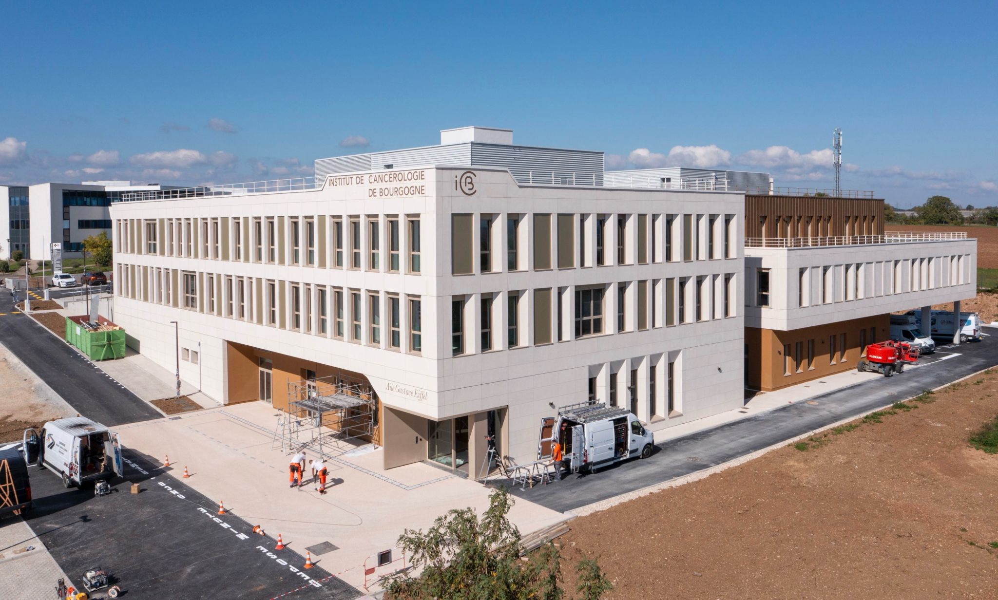 CARE Architecte livre à Dijon-Valmy un bâtiment unique réunissant l’ICB (Institut de Cancérologie de Bourgogne) et le CMNP (Centre de Médecine Nucléaire du Parc) tout en préservant leur identité propre. Deux volumes bien distincts structurent le projet : un monolithe rectangulaire enchâssé dans la pente pour l’ICB et un plateau horizontal en balcon pour le CMNP. Ces deux entités sont séparées par une rue extérieure et réunis par une passerelle, véritable épine dorsale du bâtiment, qui organise les accès, les circulations et les flux entre les services. Cette articulation claire permet d’identifier immédiatement la fonction de chaque pôle tout en affirmant leur rapprochement stratégique. La géométrie du projet s’inscrit dans la topographie du site et offre une lecture architecturale à la fois simple, forte et cohérente. Avec cette composition, CARE Architecte matérialise le rapprochement opérationnel entre deux acteurs majeurs de la santé en Bourgogne-Franche-Comté pour renforcer l’offre de soins en cancérologie et en imagerie nucléaire.